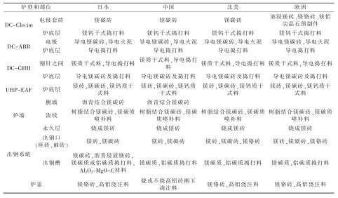 摘 要:由三根電極的普通交流電弧爐發(fā)展為超高功率(UHP)及一根電極的直流(DC)電弧爐,爐體結(jié)構(gòu)有一些改變。針對(duì)各部位的損毀因素,內(nèi)襯用的耐火材料也有所發(fā)展。例如普通電弧爐的爐頂用高鋁磚、爐墻鎂磚砌筑,而UHP及DC電弧爐采用大面積水冷爐頂、爐墻,爐頂三角區(qū)采用剛玉澆注料或預(yù)制件,爐墻用鎂碳磚,蝕損嚴(yán)重部位采用噴補(bǔ)作業(yè)。還介紹了日本等一些國家DC和UHP的各種爐型用耐火材料。煉鋼電弧爐是以電極端部和爐料之間發(fā)生的電弧為熱能進(jìn)行煉鋼的設(shè)備。電弧爐以廢鋼為爐料直接煉鋼,與礦石煉鐵后再煉鋼相比,基建投資少,節(jié)能60%、節(jié)水40%、減少廢氣排放86%、減少廢渣97%[1]。交流電弧爐歷史悠久,交流電是通過三根石墨電極輸入爐內(nèi),在電極下端與金屬料之間產(chǎn)生電弧,利用電弧高溫直接加熱爐料,使煉鋼過程得以進(jìn)行。供電功率越高,爐料熔化速度越快,降低能量消耗越多,因此出現(xiàn)超高功率(UHP)電弧爐。在超高功率的基礎(chǔ)上發(fā)展了直流(DC)電弧爐煉鋼。直流電弧爐是以一根石墨電極的端點(diǎn)為陰極,爐底為陽極,石墨電極位于爐膛中心部位。與UHP相比設(shè)備結(jié)構(gòu)簡(jiǎn)單,建設(shè)費(fèi)用低,熔池中的電流與熱量分布比較均勻,不存在過熱區(qū)域,因此耐火材料損耗比較小、節(jié)能且噪音小等。目前,煉鋼電弧爐向大型化、控制自動(dòng)化方向發(fā)展。我國的電弧爐主要用來生產(chǎn)合金鋼。煉鋼水平與工業(yè)發(fā)達(dá)國家相比差距較大,如2015年我國電爐鋼占粗鋼總產(chǎn)量的6.1%,2020年有所提高,但也不超過10%,與世界平均水平的30%相比還有較大差距。我國已經(jīng)引進(jìn)先進(jìn)水平的UHP和DC電弧爐,隨著經(jīng)濟(jì)發(fā)展,工業(yè)化程度提高,必然伴以廢鋼資源數(shù)量增加,同時(shí)發(fā)展鐵礦石直接還原煉鐵技術(shù),代替廢鋼,增加電弧爐煉鋼的爐料,還有核電的發(fā)展,使電弧爐煉鋼有了物質(zhì)保證。電弧爐的內(nèi)襯是耐火材料構(gòu)成的,隨著UHP和DC技術(shù)的發(fā)展,需要新型優(yōu)質(zhì)耐火材料與之相配套。有人說[2]:沒有優(yōu)質(zhì)爐襯、爐底耐火材料支持長(zhǎng)壽爐齡,超高功率電弧爐就無法發(fā)揮高效生產(chǎn)的優(yōu)勢(shì)。爐底耐火材料是直流電弧爐得以實(shí)現(xiàn)的必要條件,反映了煉鋼與耐火材料技術(shù)的互相影響,互為依存,在電弧爐煉鋼系統(tǒng)優(yōu)化生產(chǎn)中有不可分割的作用。1 電弧爐的結(jié)構(gòu)變化傳統(tǒng)的電弧爐由爐頂(又稱爐蓋)、爐墻、爐坡、爐底和出鋼槽構(gòu)成,全部用耐火材料構(gòu)筑,外包鋼制爐殼。爐墻一側(cè)設(shè)有爐門,另一側(cè)為出鋼口,并與出鋼槽相連。而UHP和DC電弧爐采用偏心爐底出鋼,使?fàn)t體由傾動(dòng)式改為固定式,爐底有供氣攪拌設(shè)置,爐頂安裝氧-燃料燒嘴,在爐底偏心位置設(shè)置出鋼口,代替出鋼槽。由于取消了傾動(dòng)設(shè)備,擴(kuò)大了水冷面積,緩和了爐襯的損毀,適當(dāng)降低了出鋼溫度,并縮短了出鋼時(shí)間,從而降低生產(chǎn)成本。爐墻采用鑲砌水冷箱式水冷套措施,其內(nèi)表面噴涂一層耐火涂料,使其掛渣形成保護(hù)層,可有效降低耐火材料消耗,但電耗可能增加。國外有的電弧爐功率達(dá)1 000 kV·A/t以上,爐墻壽命達(dá)2 000爐次以上,水冷爐蓋壽命達(dá)4 000爐次,降低耐火材料消耗60%以上。2 耐火材料內(nèi)襯的損毀因素電弧爐內(nèi)襯的耐火材料長(zhǎng)期處于高溫、熔渣侵蝕和急熱急冷狀態(tài)下,工作條件極其惡劣。在煉鋼的熔化期和氧化期,不致于因高溫?fù)p壞爐襯,但在還原期的鋼液溫度相當(dāng)高,又受電弧直接輻射(有時(shí)溫度達(dá)4 000℃以上),爐襯很容易造成熔融損壞。出完鋼裝料時(shí),爐襯溫度突然下降,裝完料開始送電,溫度又逐漸升高,這種急冷急熱是爐襯剝落的直接原因,主要是爐頂容易剝落。耐火材料內(nèi)襯損毀的主要因素包括[3]:(1)化學(xué)侵蝕。FeO或渣中SiO2與耐火材料中的CaO、MgO之間的化學(xué)反應(yīng),使?fàn)t襯變?yōu)槿墼?,而?dǎo)致?lián)p毀。(2)耐火材料內(nèi)襯中的碳成分被含氧成分(如FeO、O2、MgO等)氧化,導(dǎo)致耐火材料脫碳而損毀。(3)沖刷和機(jī)械沖擊。鋼水或熔渣流過耐火材料表面,以物理性磨損或沖刷爐襯,而導(dǎo)致內(nèi)襯損毀;在出鋼口、渣線、電極口或排氣口平臺(tái)等沖刷嚴(yán)重,廢鋼等爐料吊入往往撞擊爐襯而損毀。(4)水化。在生產(chǎn)過程中,往往會(huì)出現(xiàn)爐頂或爐墻漏水或滲水,還有水蒸氣,與堿性耐火材料中的MgO、CaO進(jìn)行水化反應(yīng),使內(nèi)襯損毀。3 電弧爐用耐火材料根據(jù)電弧爐的結(jié)構(gòu),由于各部位承受的熱負(fù)荷大小不同,與熔渣、鋼水接觸作用及機(jī)械損壞程度存在差異,不同部位必須采用不同的耐火材料[4]。3.1 爐頂(蓋)我國中小電弧爐普遍采用燒成或不燒高鋁磚,局部用高鋁質(zhì)或剛玉質(zhì)不定形耐火材料預(yù)制件。大型超高功率電弧爐和直流電弧爐采用水冷技術(shù),除三角區(qū)外,爐頂耐火材料不是關(guān)鍵。三角區(qū)由于強(qiáng)烈熱震及電極熱輻射苛刻,國外普遍采用剛玉質(zhì)或鋁鉻質(zhì)搗打料,我國一般用高鋁質(zhì)或剛玉質(zhì)搗